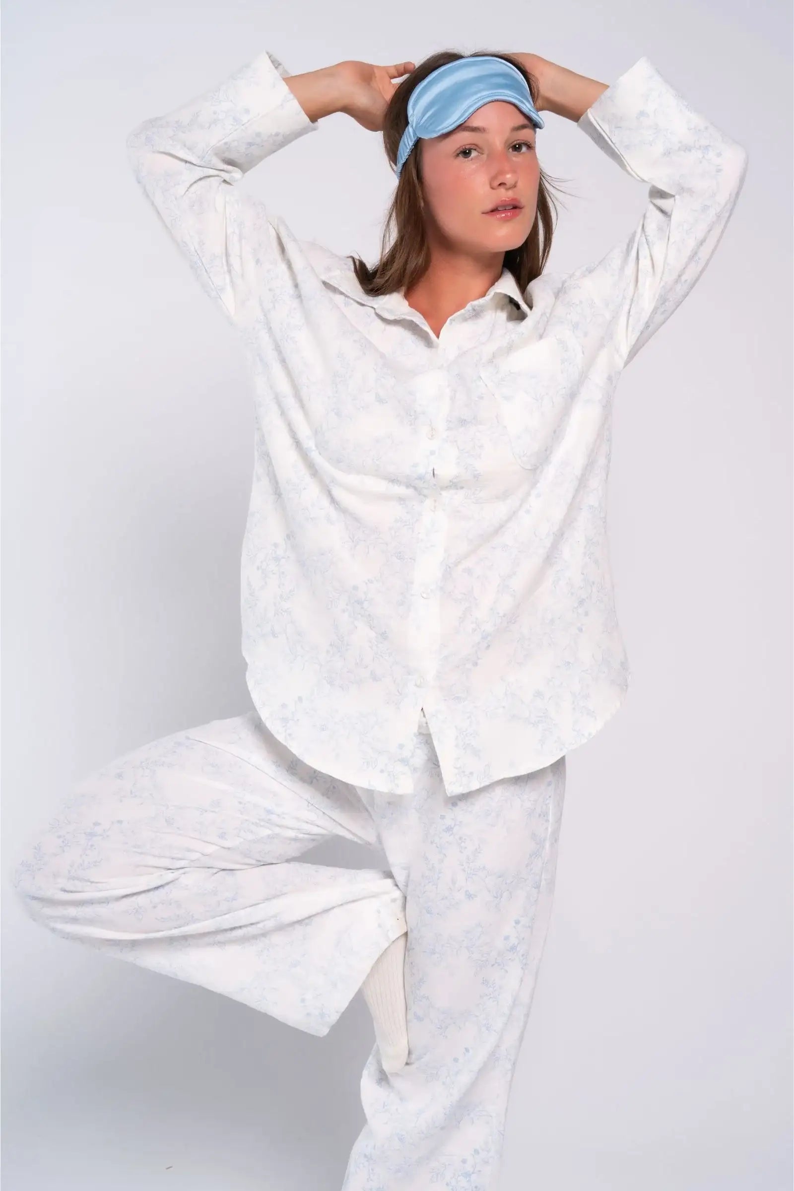 Discover effortless comfort with our botanical print pyjama set, crafted from soft and breathable textured cotton. Featuring a delicate sage green floral print, this set is perfect for relaxing in style. The classic button-front top includes a notch collar and chest pocket, while the matching pants provide a perfect, comfortable fit with an adjustable drawstring waist. Lightweight and airy, this set is ideal for Egypt's warm climate, keeping you cool whether you're sleeping or lounging.