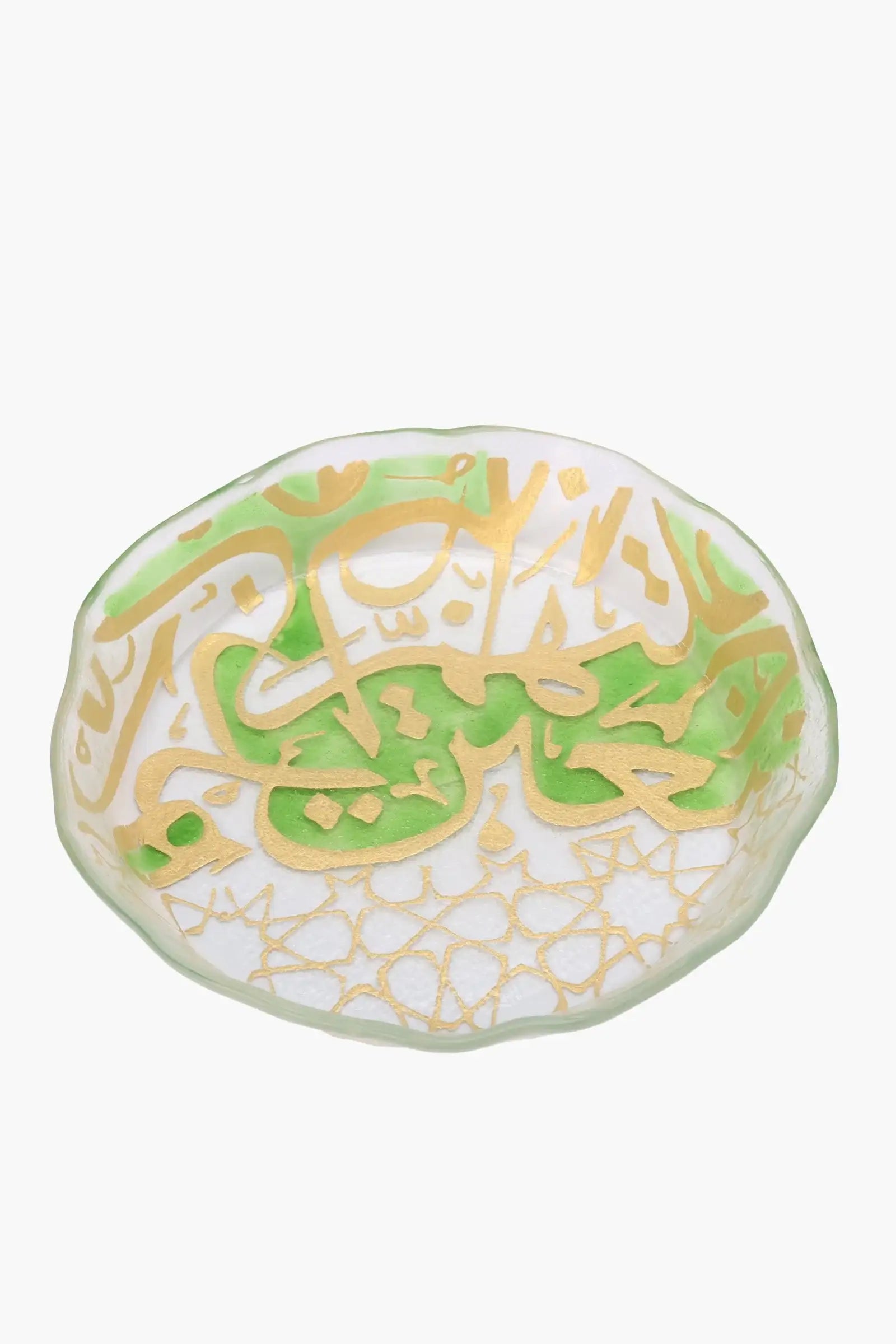 Elevate your table setting with this Glass Bowl Plate, designed with the same elegant aesthetic as the matching rectangular platter. Featuring golden Arabic calligraphy and delicate green geometric patterns, it brings a refined and festive feel to your serving ware. Its rounded bowl shape with a shallow depth makes it ideal for presenting dates, nuts, salads, or desserts during Ramadan, Eid, or special family occasions.