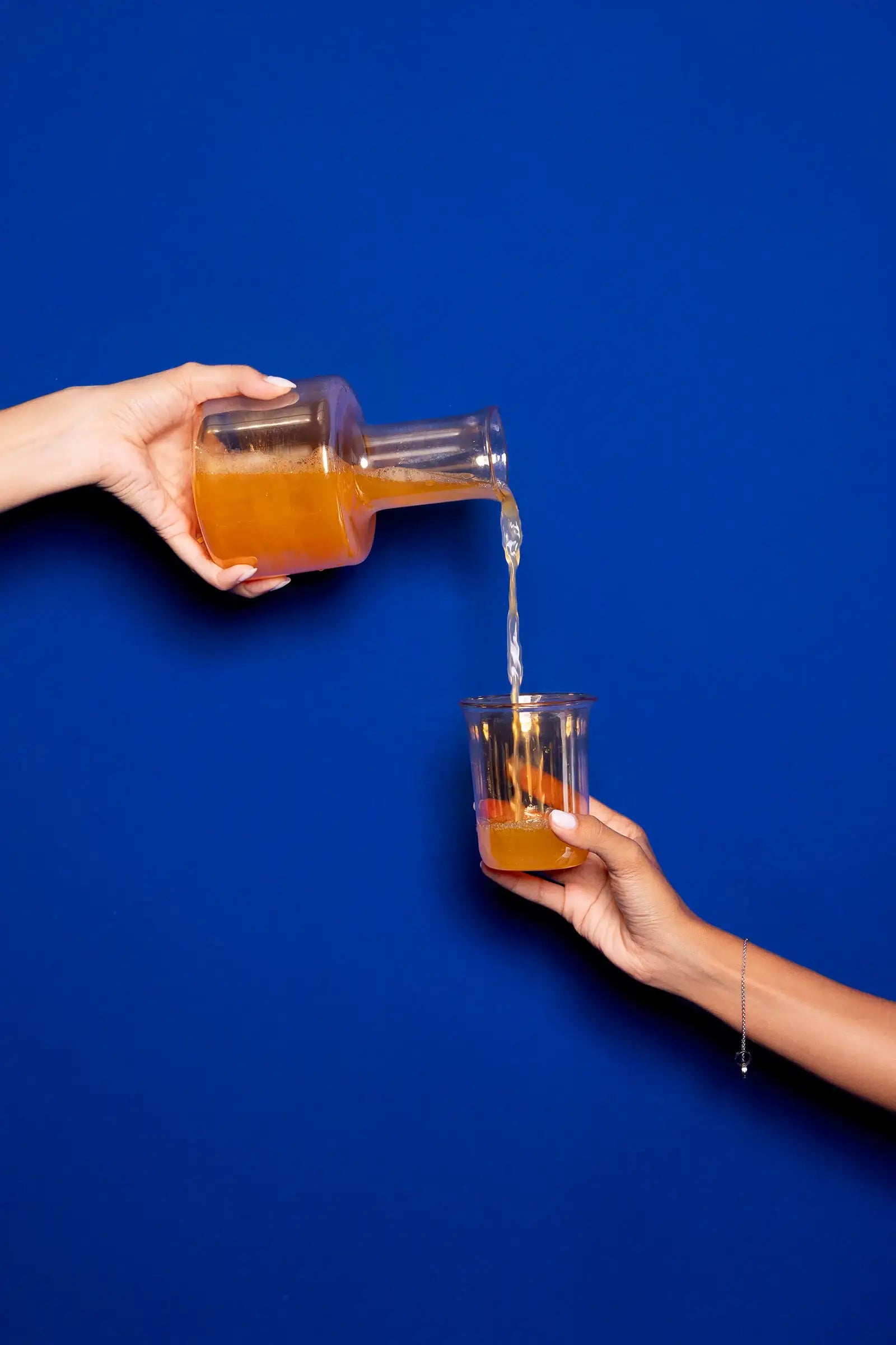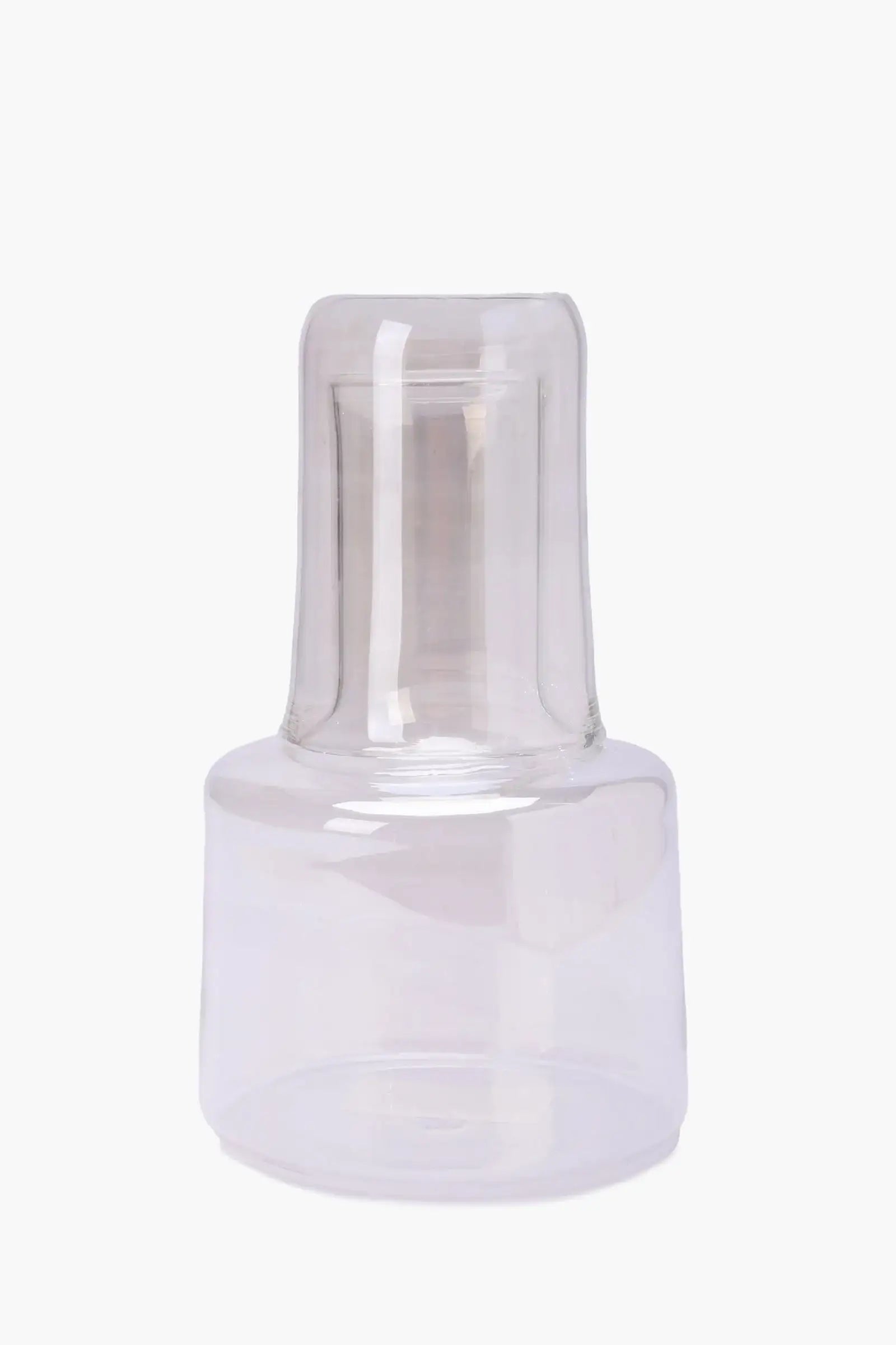 - Clear glass jug with matching drinking cup