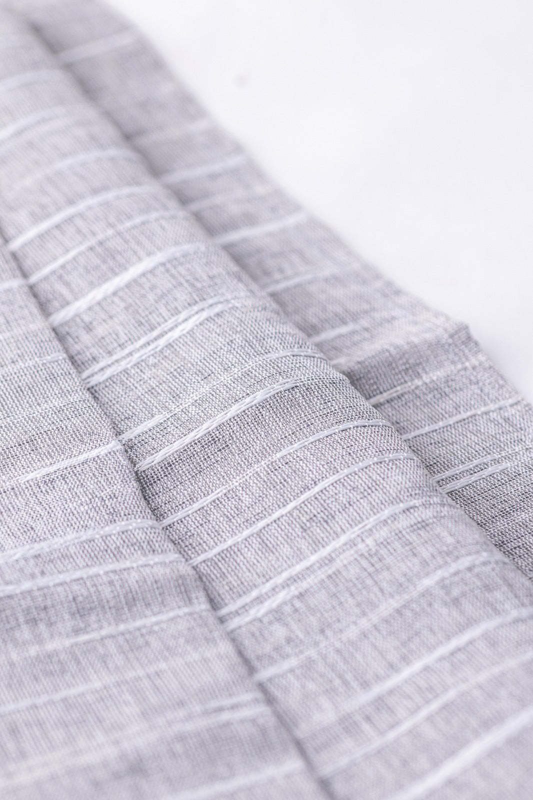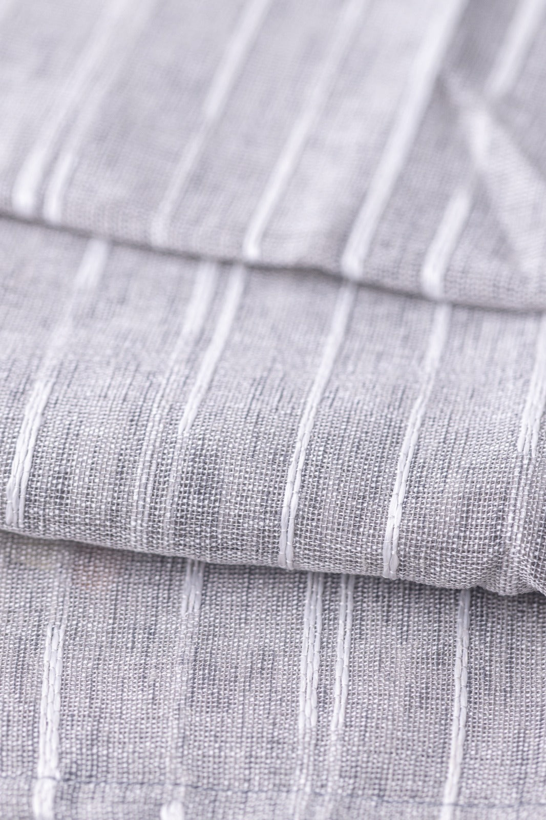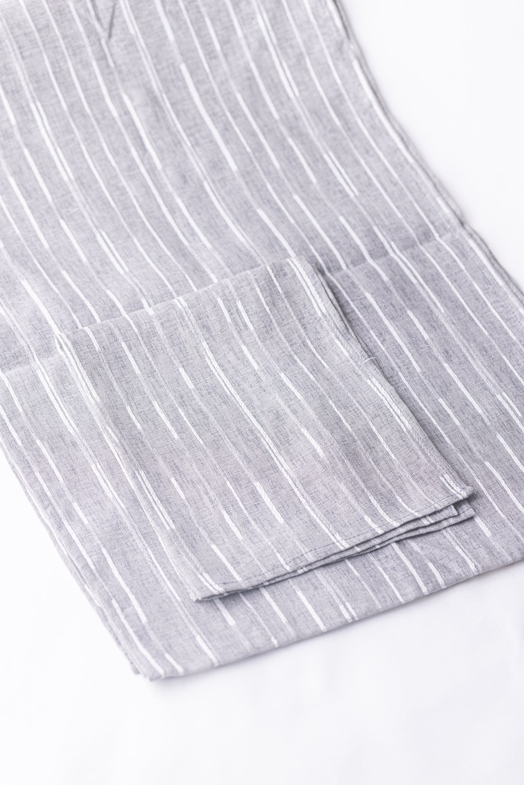 This Grey Striped Table Runner is a versatile and elegant addition to any dining or console table. Its neutral grey base is woven with fine white horizontal stripes, creating a classic and clean pattern that complements virtually any décor style. The fabric appears to be a lightweight blend with a visible, textured weave (possibly a cotton or linen blend), giving it a soft drape and a relaxed, casual yet sophisticated feel. It is perfect for both daily use and as a foundation for special table settings.