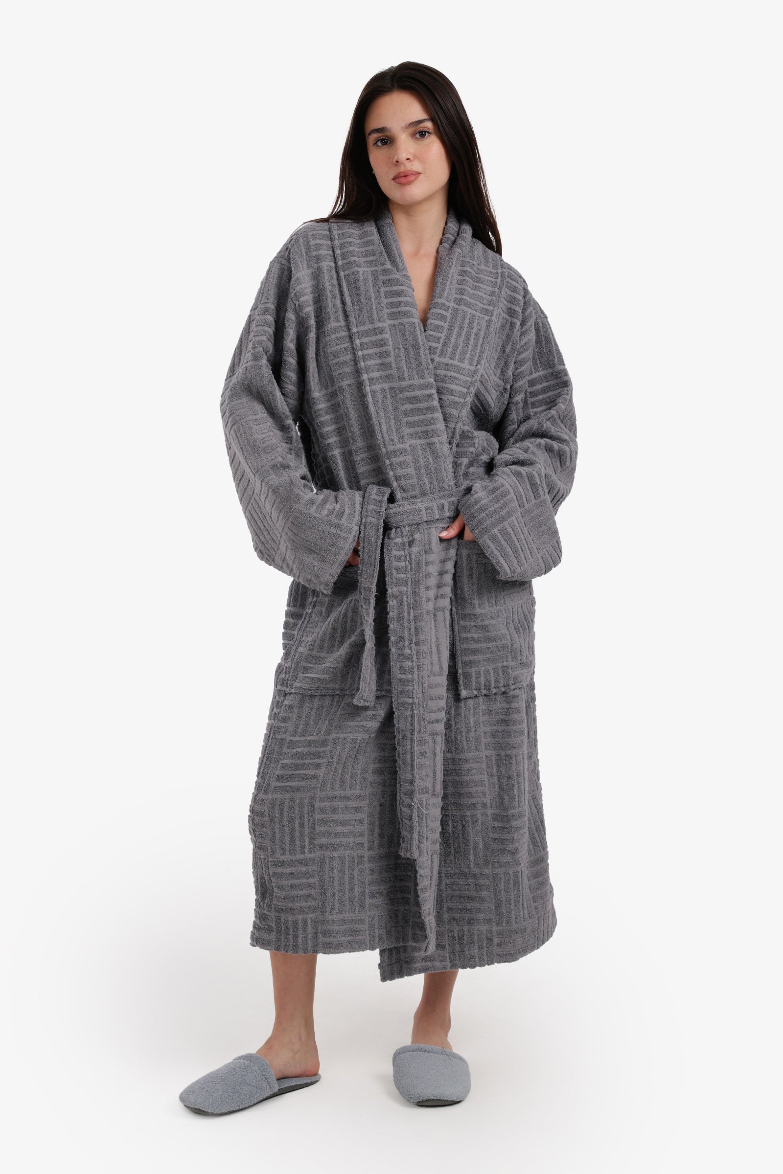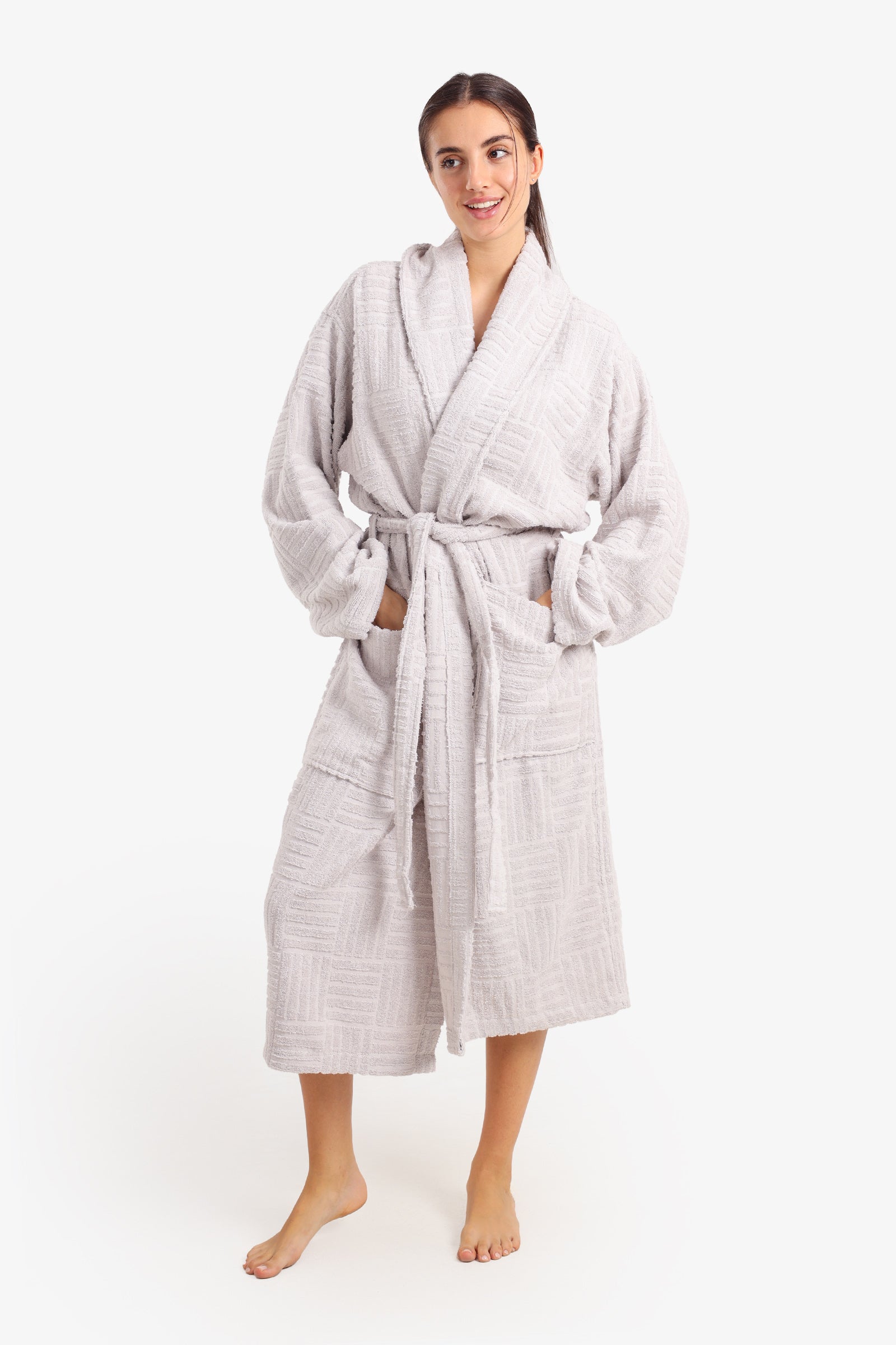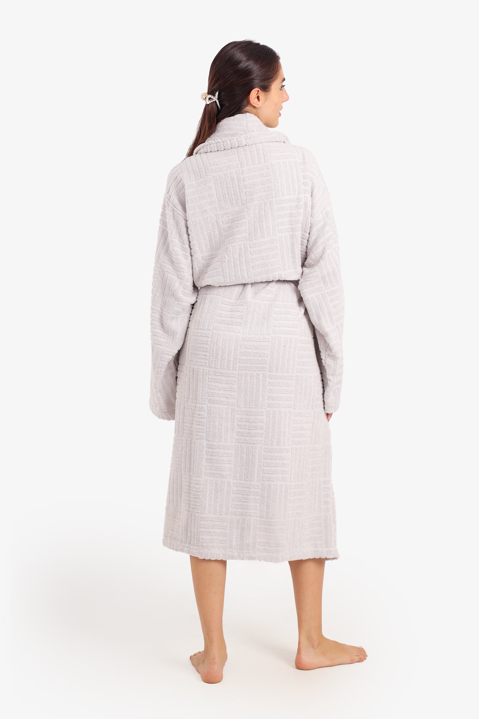 Elevate your lounging routine with this grid-pattern bathrobe, crafted for ultimate comfort and style. Featuring a relaxed fit and open neckline, it drapes effortlessly for a laid-back yet refined look. The long sleeves and waist belt ensure a cozy, adjustable fit, while the two front pockets add a functional touch. Designed in a chic midi length, this bathrobe is perfect for relaxing mornings or winding down in timeless comfort.