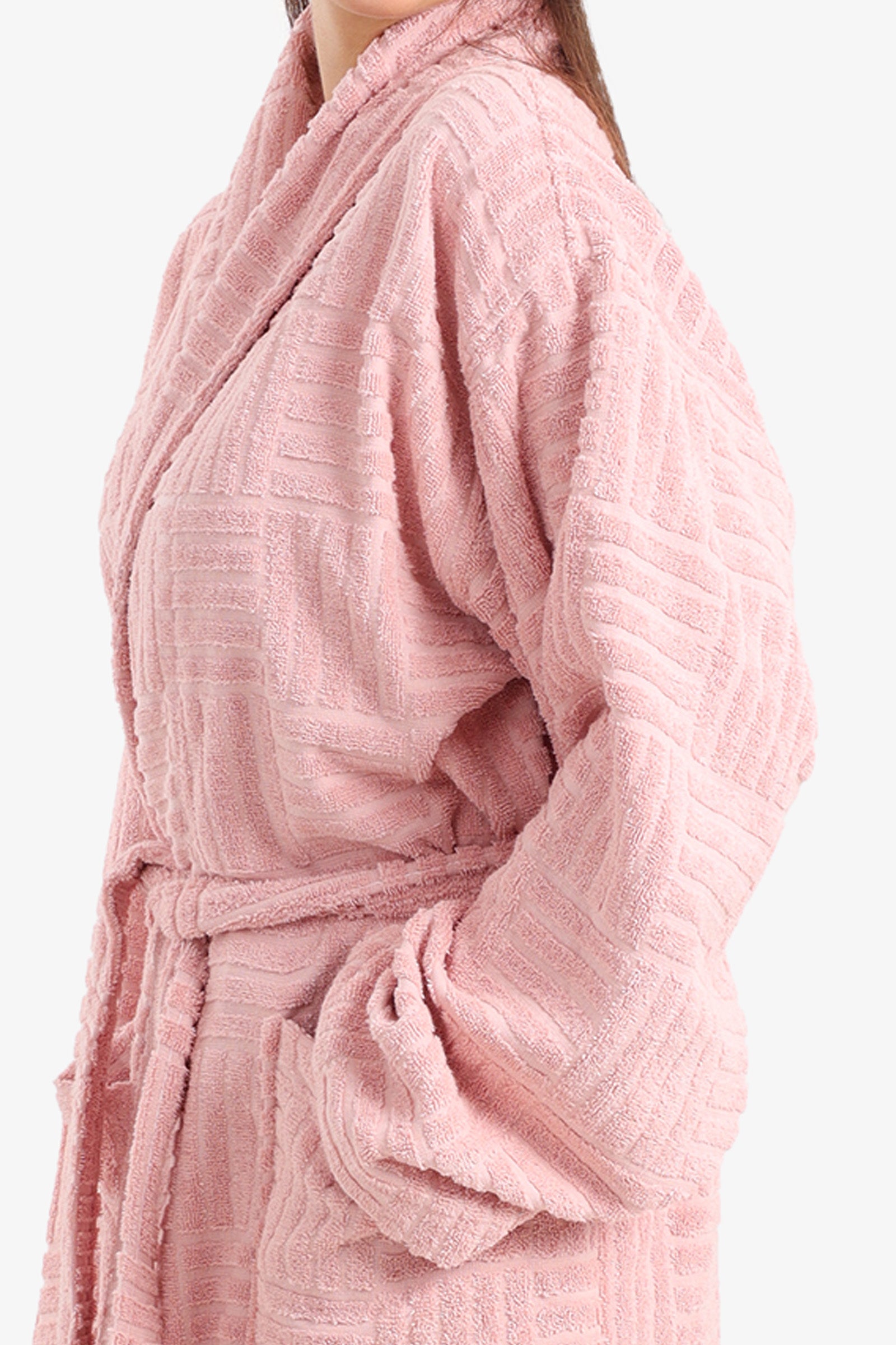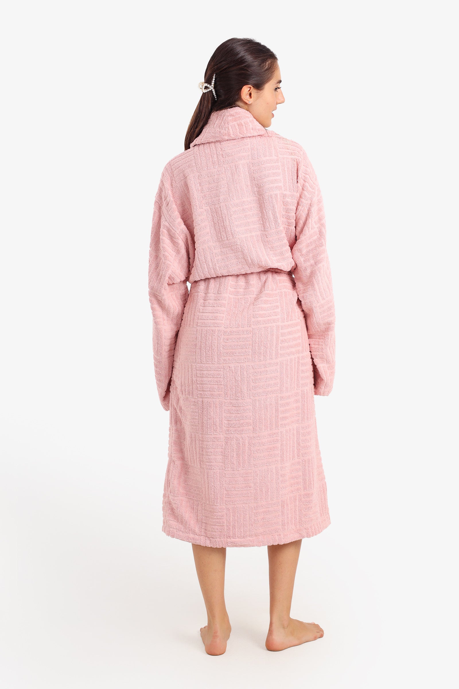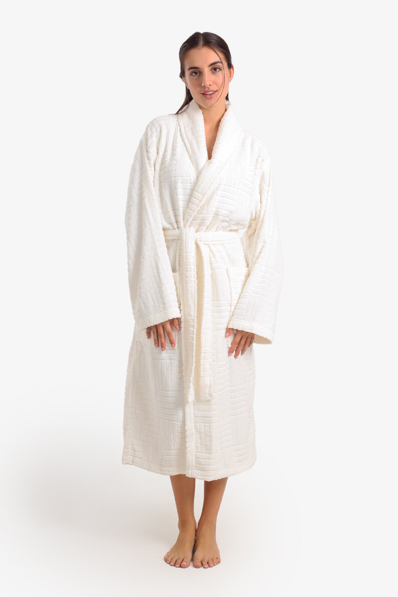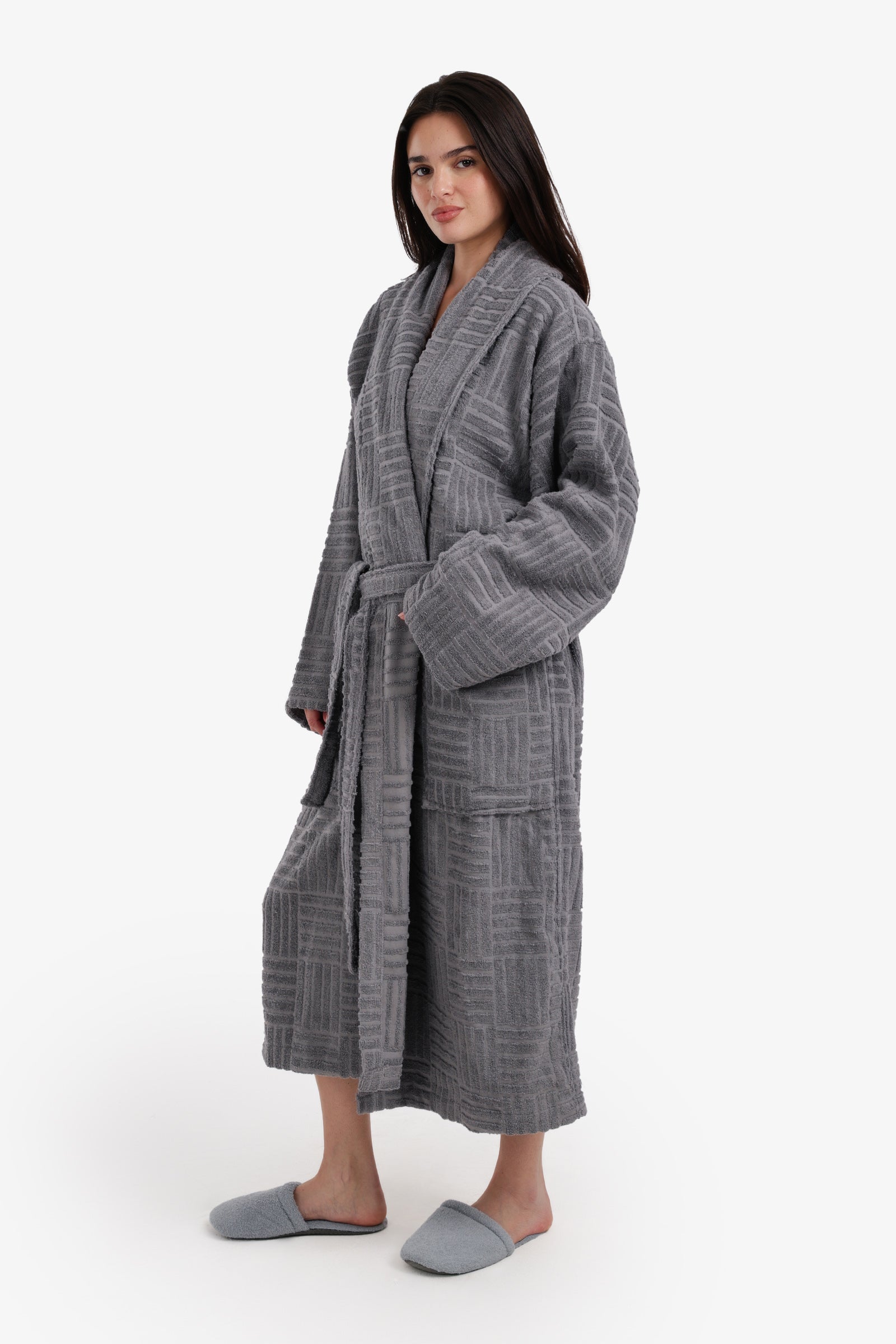 Elevate your lounging routine with this grid-pattern bathrobe, crafted for ultimate comfort and style. Featuring a relaxed fit and open neckline, it drapes effortlessly for a laid-back yet refined look. The long sleeves and waist belt ensure a cozy, adjustable fit, while the two front pockets add a functional touch. Designed in a chic midi length, this bathrobe is perfect for relaxing mornings or winding down in timeless comfort.