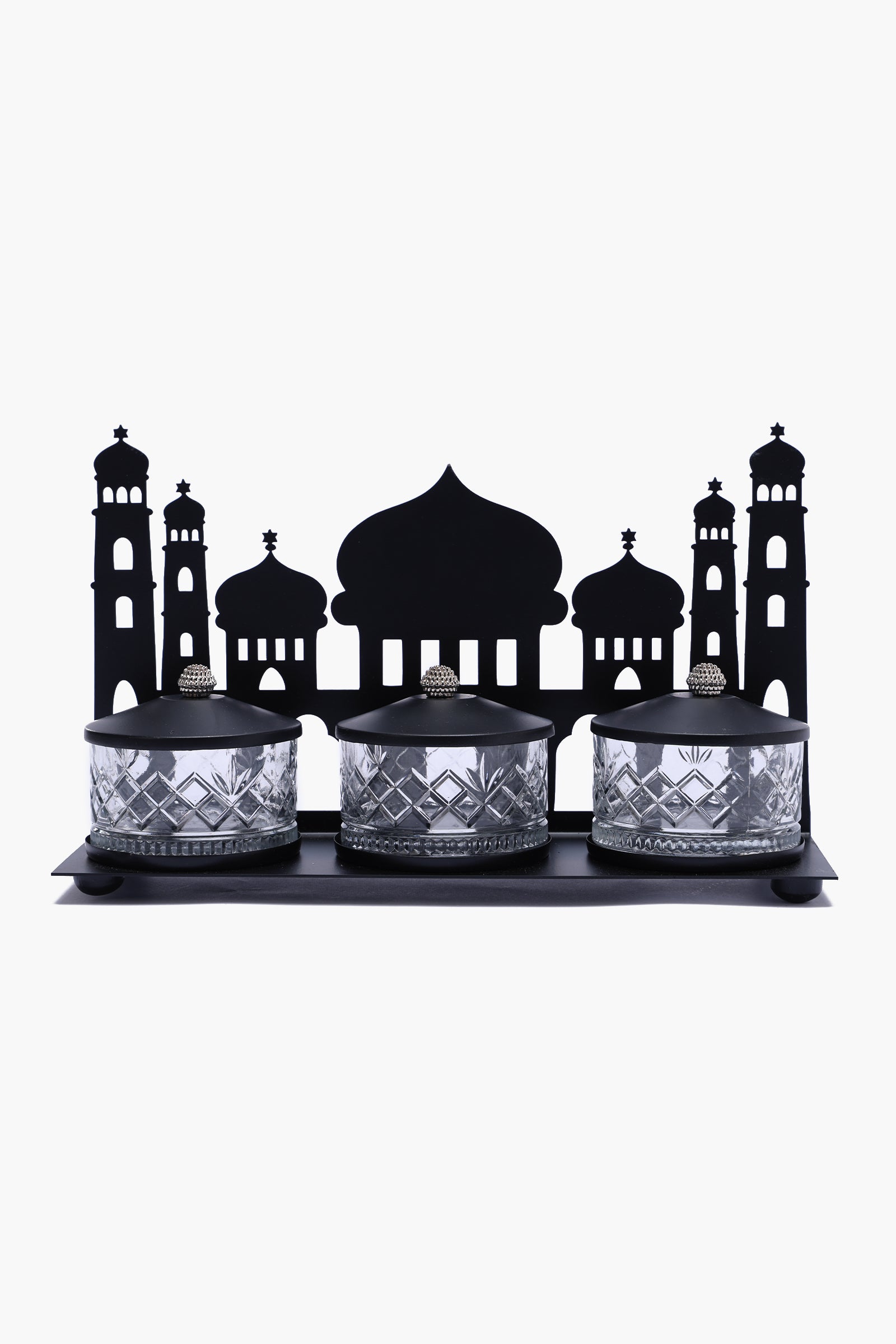 Add a touch of elegance to your table with this mosque-inspired snack set. Featuring a striking metal silhouette of mosques, it holds three diamond-cut glass jars with decorative lids, all neatly arranged on an integrated metal base. Perfect for serving dates, nuts, or treats, it combines functionality with a sophisticated, festive design.