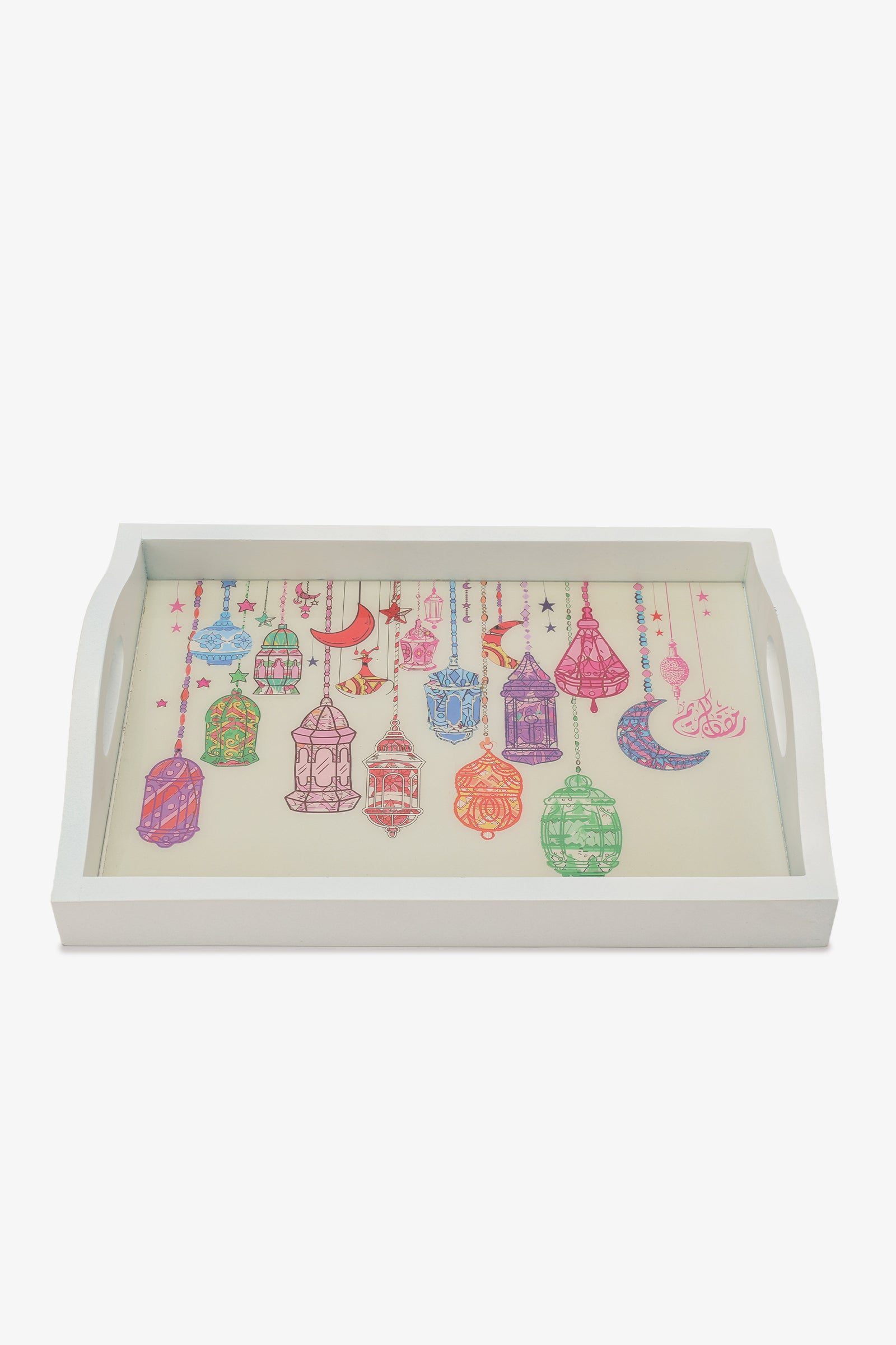 Add a festive touch to your home with this Ramadan-themed tray. Crafted from durable MDF, it features a rectangular shape and two convenient handles for easy carrying. Its playful and artistic design makes it perfect for serving snacks, drinks, or sweets during gatherings, while also doubling as a decorative piece to celebrate the season in style.