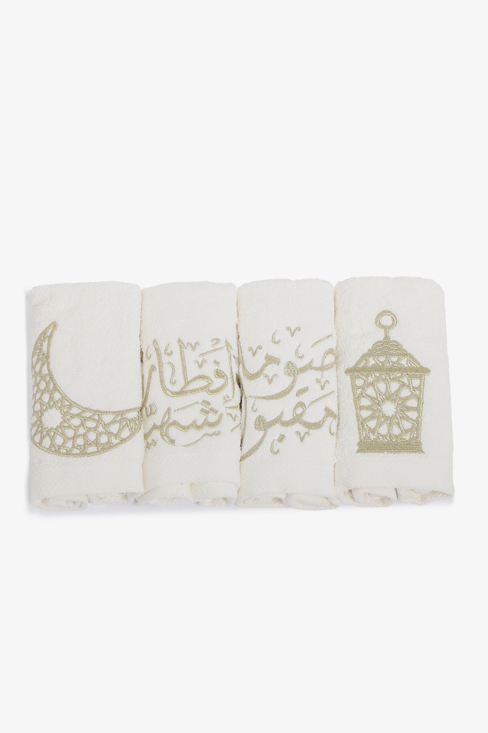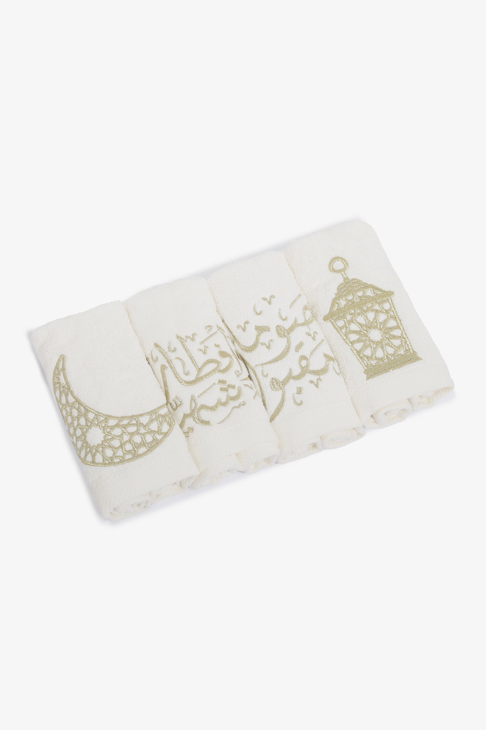 Celebrate Ramadan in style with this pack of 4 festive towels, each measuring 30x30 cm. Made from soft, absorbent cotton, they feature elegant embroidery of the Crescent Moon, a traditional lantern, and Arabic calligraphy, along with meaningful phrases like "Iftar Shahia" and "Sawman Maqboolan." The neutral cream-and-silver palette blends beautifully with any décor, making them perfect for daily use, guest bathrooms, or as a thoughtful festive gift.