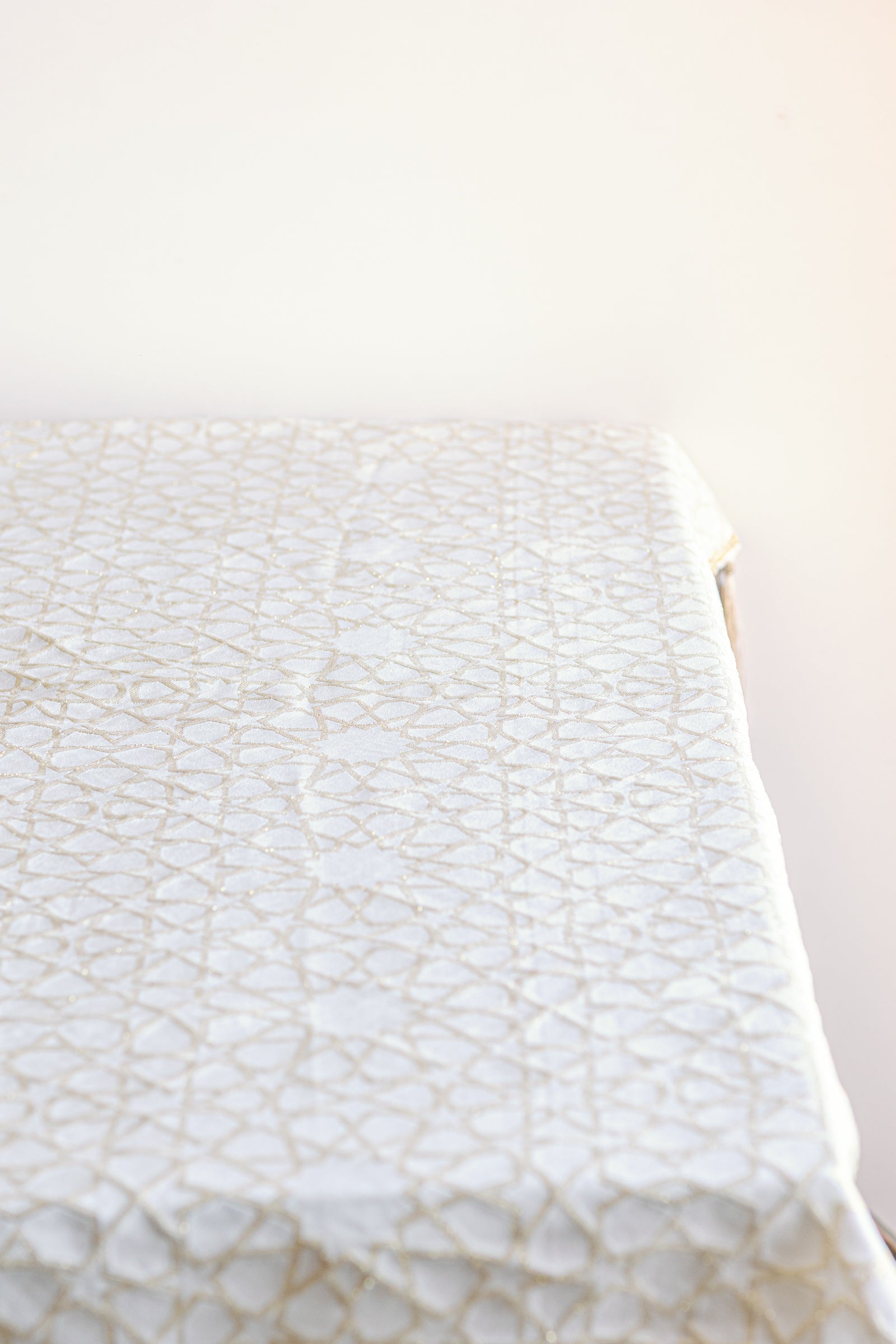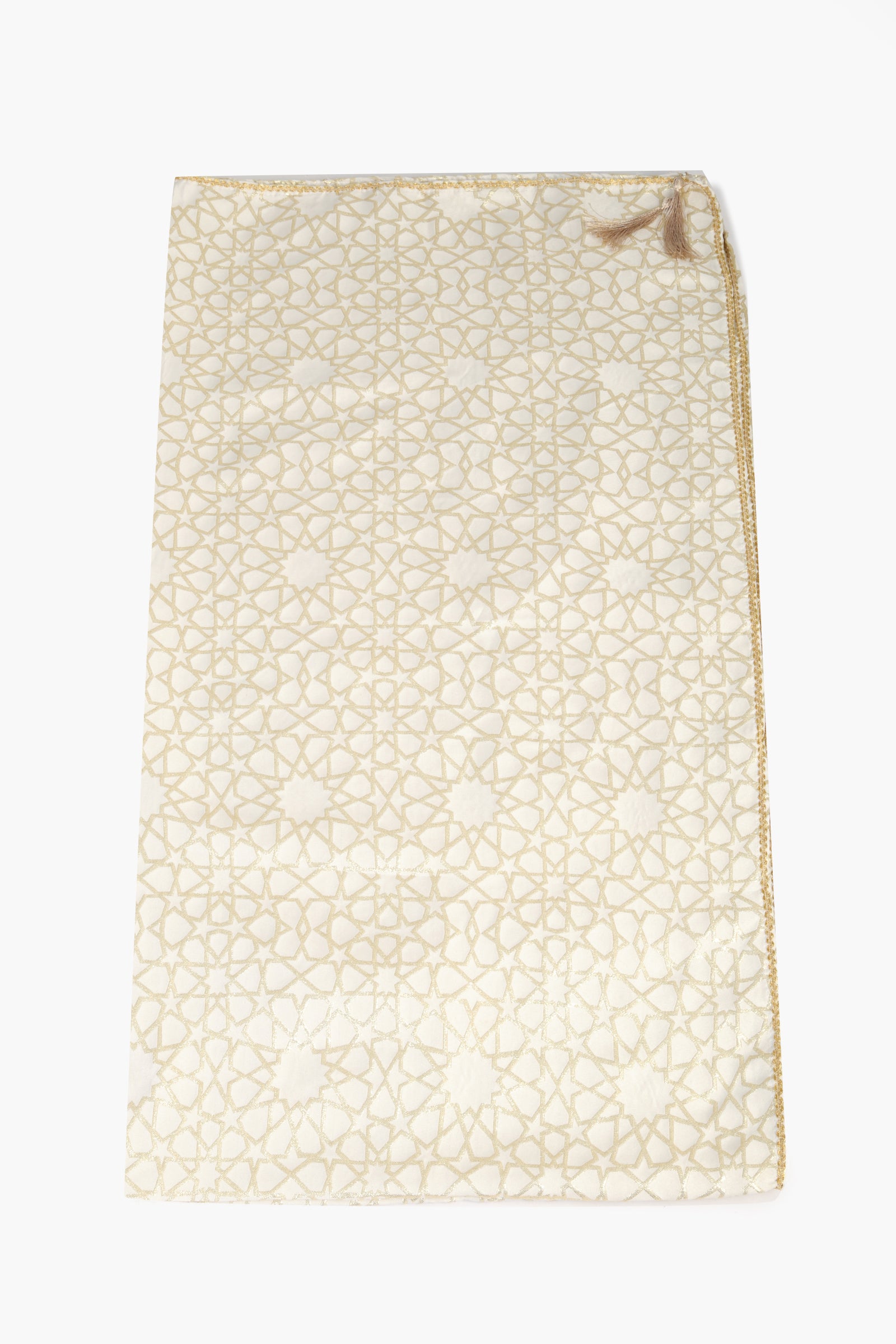 Elevate your festive table with this elegant tablecloth, featuring an intricate Islamic geometric pattern in shimmering gold. Star and arabesque motifs add timeless charm, while tonal tassels and gold-stitched borders create a refined finish. On a crisp cream base, its neutral palette pairs effortlessly with any dinnerware, perfect for Iftar, Suhoor, or Eid celebrations.