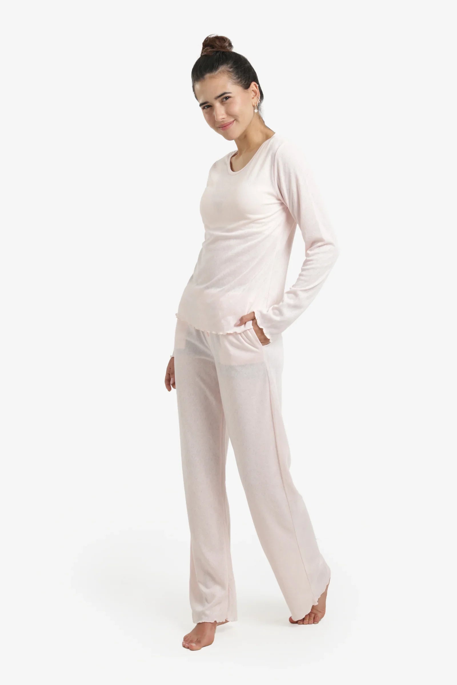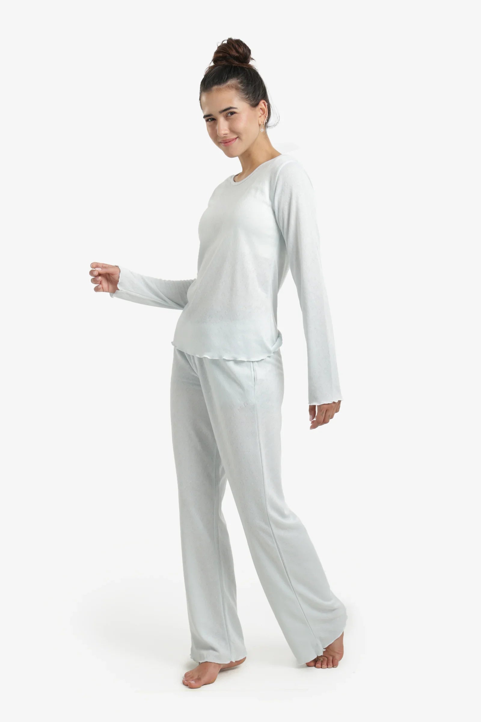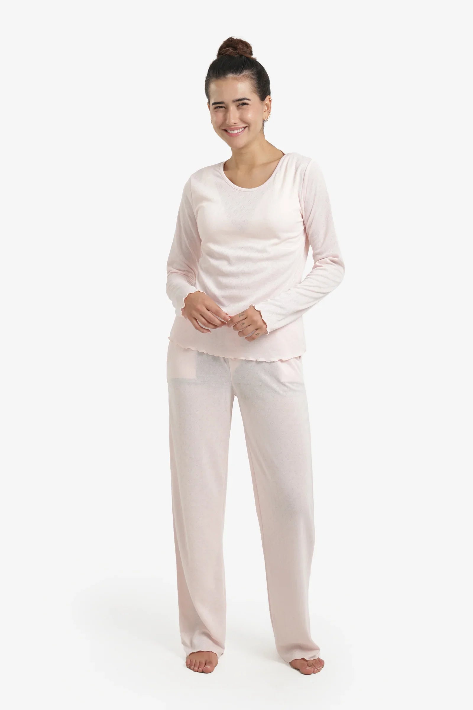 This comfortable and stylish pyjama set is designed for a cozy night's sleep or relaxed lounging. Made from soft polyester, it features a regular fit that allows for ease of movement. The top has a classic round neck and long sleeves, while the full-length trousers are equipped with an elasticated waist and convenient side pockets. The set is detailed with a subtle self-pattern and a charming wavy trim, adding a touch of elegance to your sleepwear collection.