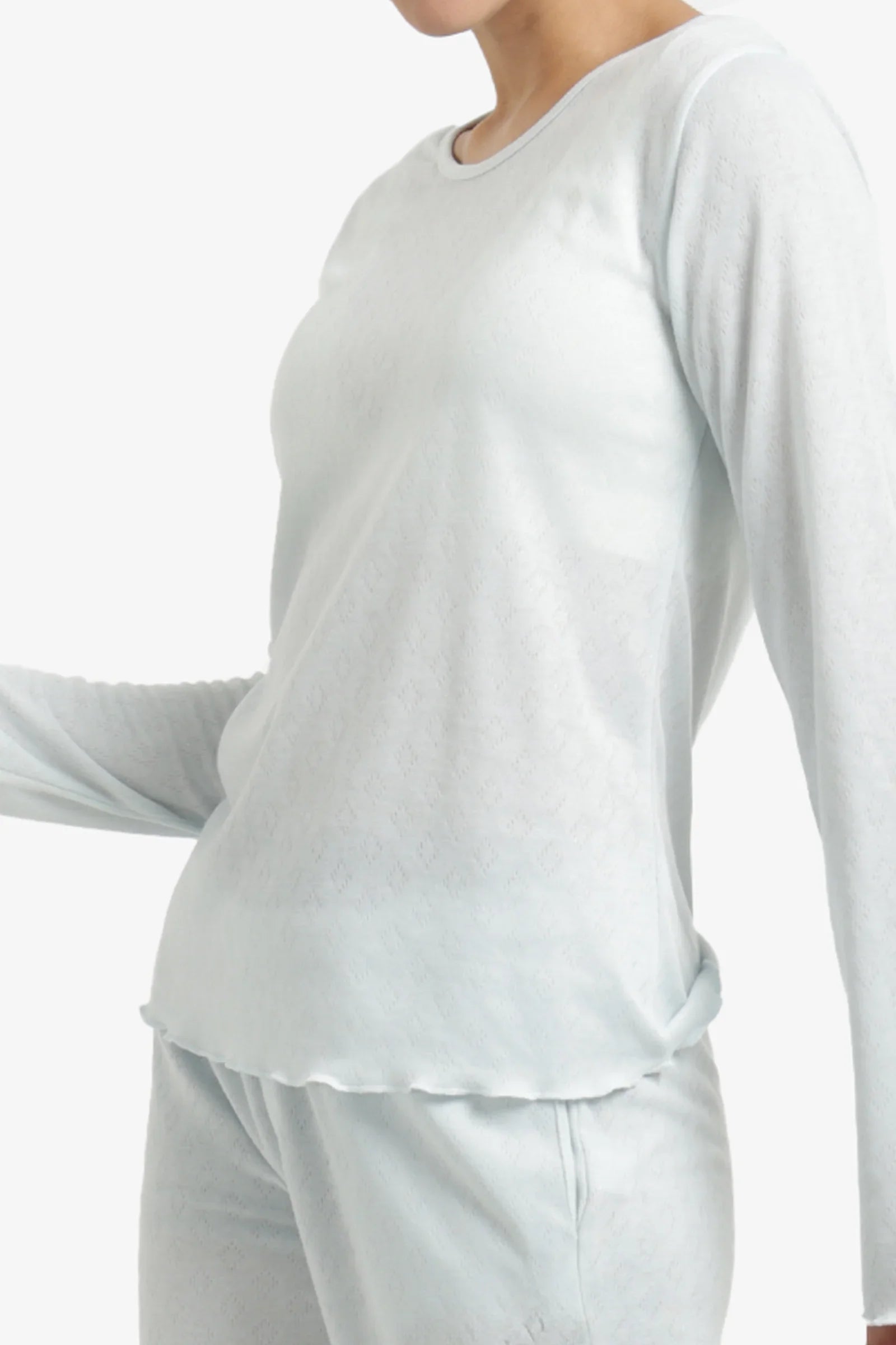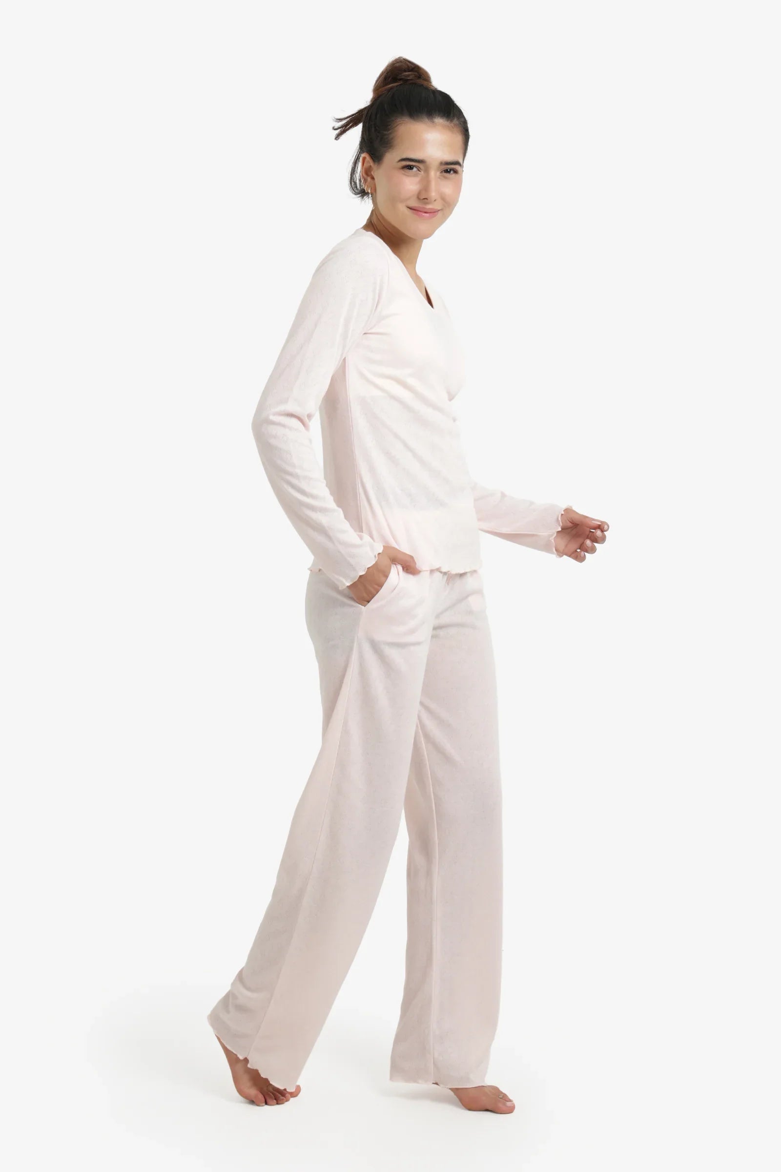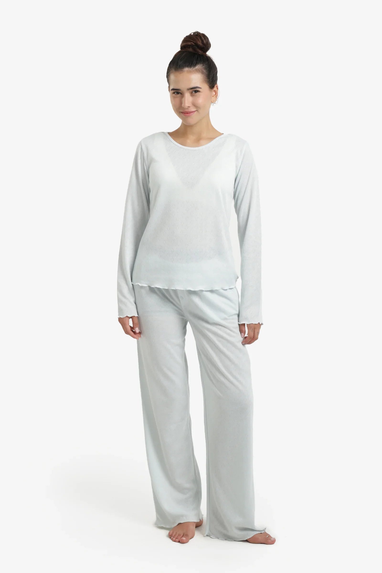 This comfortable and stylish pyjama set is designed for a cozy night's sleep or relaxed lounging. Made from soft polyester, it features a regular fit that allows for ease of movement. The top has a classic round neck and long sleeves, while the full-length trousers are equipped with an elasticated waist and convenient side pockets. The set is detailed with a subtle self-pattern and a charming wavy trim, adding a touch of elegance to your sleepwear collection.