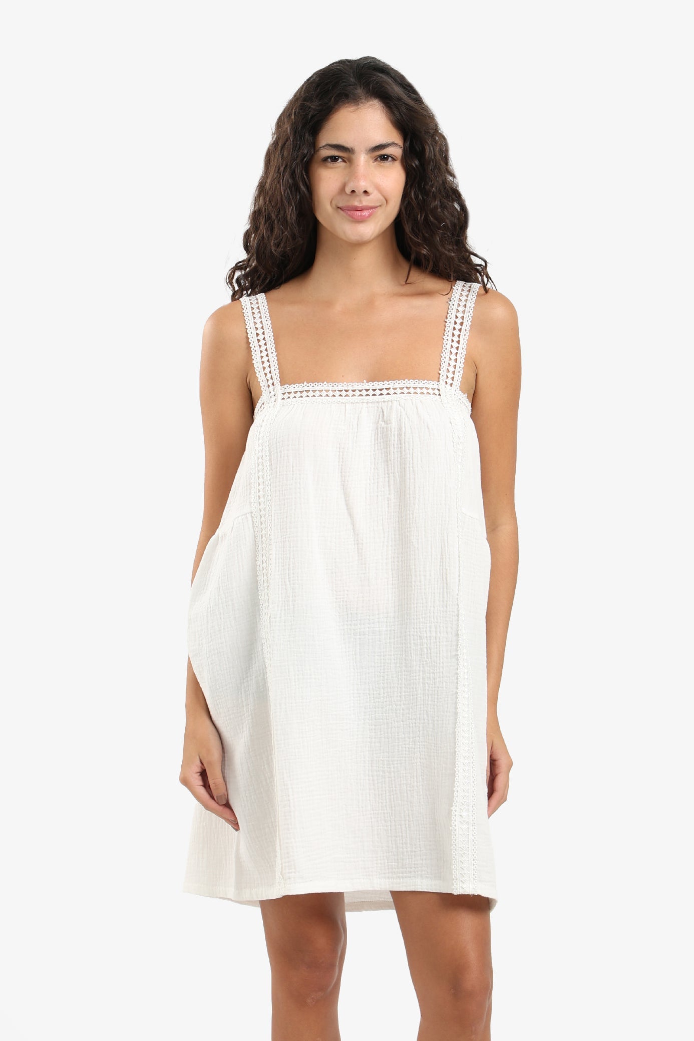 Embrace effortless comfort with this above-knee nightgown, crafted from soft, breathable cotton for a relaxed, all-night wear. Featuring a sleeveless design and a flattering square neckline, it is accentuated with delicate crochet detailing for a subtle, feminine touch. Its solid pattern and relaxed fit make it perfect for lounging at home, combining style and ease in one cozy piece.