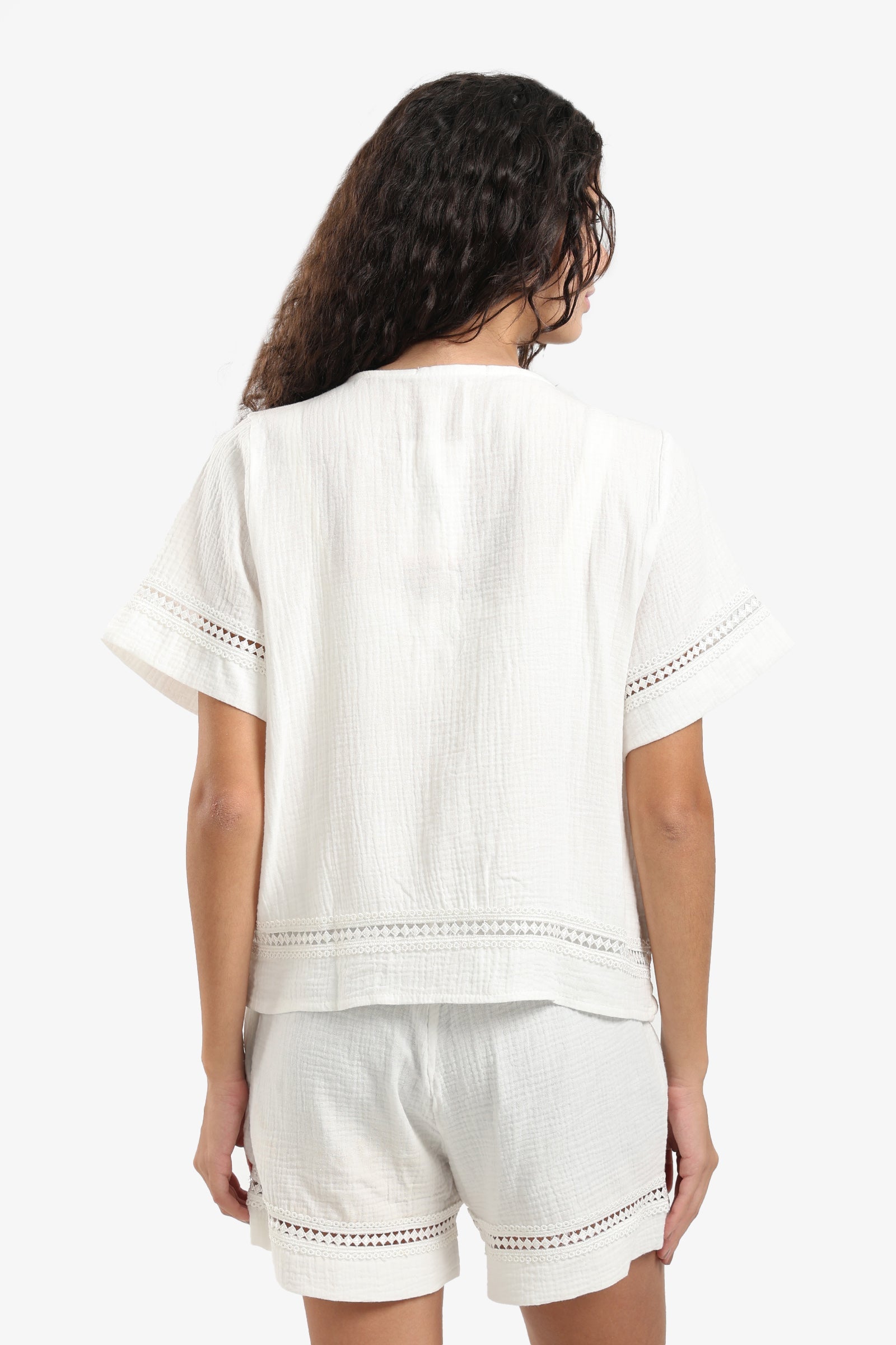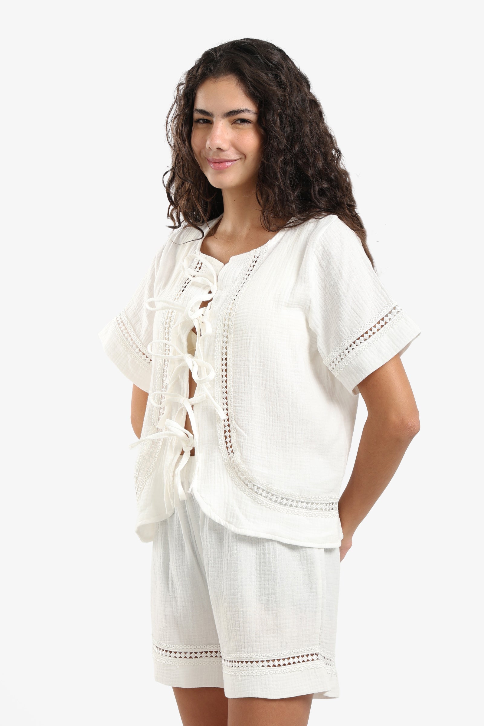 Bring a touch of charm to your sleepwear with this Cotton Pyjama Set, designed for comfort with a stylish twist. Made from breathable cotton, it features a regular fit that keeps you cool and cozy all night. The top is detailed with a lace-up front closure, short sleeves, and delicate lace accents that add a feminine finish. Paired with elastic waist shorts, this set combines ease with elegance—perfect for warm nights or lounging at home.